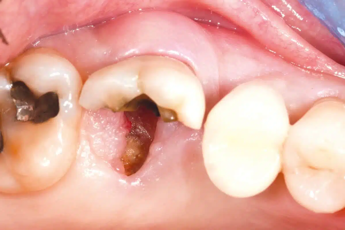 A patient presented with a fractured maxillary first molar (tooth 16) requiring extraction. Due to significant bone loss, a staged approach was planned, performing bone augmentation followed by delayed implant placement.